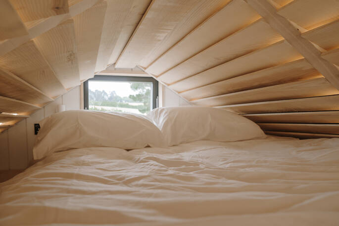 - Two queen-sized beds, one on a mezzanine accessed via a ladder. Children over 2 can be accommodated.