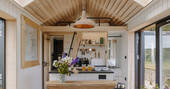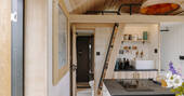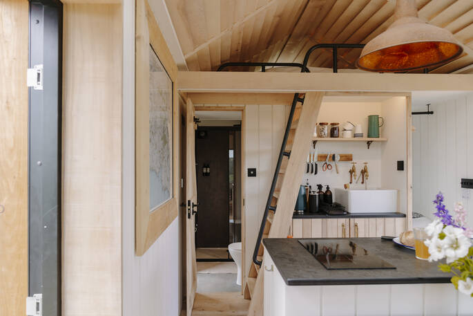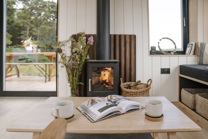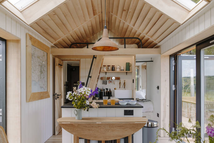 Location isn’t the only special element here at Flete, the spaces themselves are designed and curated down to the last detail – with every square inch utilised amazingly. Inside you’ll find a spot to relax or read by the giant picture window, space to sit by the wood burner with a cuppa – and somehow space for kitchen and bedroom. Outside, you’ll be thrilled to find hammocks in the woodland, a picnic table, and both an outdoor shower and wood fired bath!
