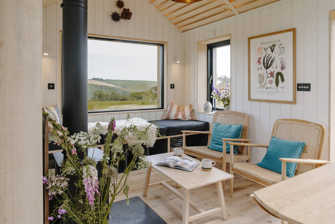 Setting is vital, and that’s why Pointy, and her sister cabin, Curvy, are sat in a nine-acre field, amongst 5000 acres of The Flete Estate, and the even larger South Devon Area of Outstanding Natural Beauty. From this incredible spot, you’ll have panoramic views up of the area – which is a SSSI and marine conservation zone. As if this wasn’t enough, it’s a five-minute walk to the private Pamflete Beach (so secluded, it’s not even marked on a map). If you’re not lazing on the sands, or taking to the water to wild swim, paddleboard or otherwise make use of the estuary on your doorstep – then you’ll be back at the beautiful space itself.