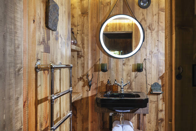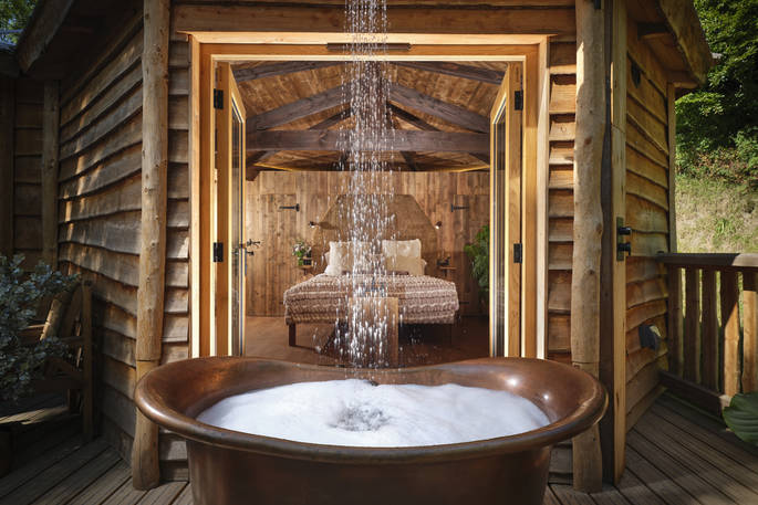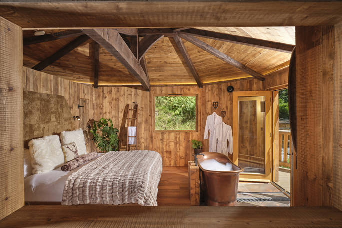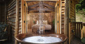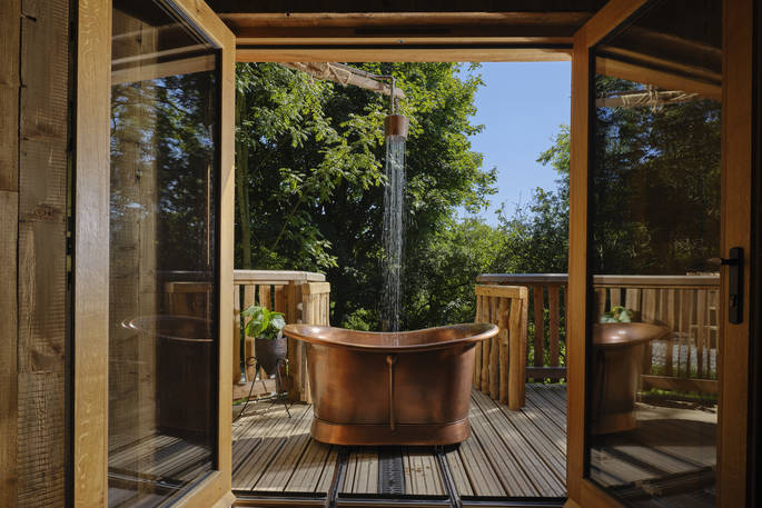 A one-of-a-kind escape Hideout Treehouse is the only treehouse in the UK with a moving bath. Whatever the weather, you can roll your bath onto the terrace and relax with birds singing in the background or take an outdoor shower. The wood-fired hot tub surrounded by young woods is perfect for evenings under the stars with a glass of something chilled.