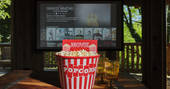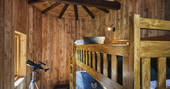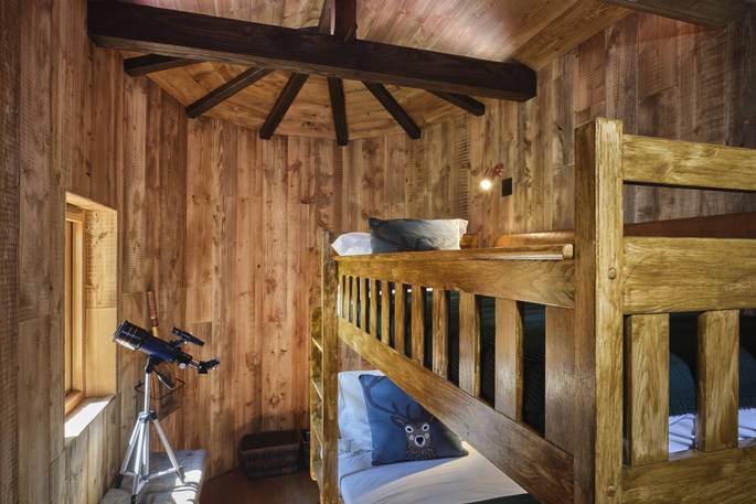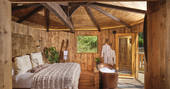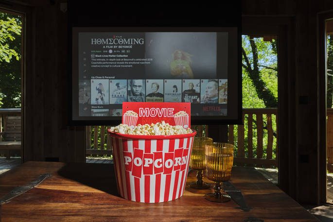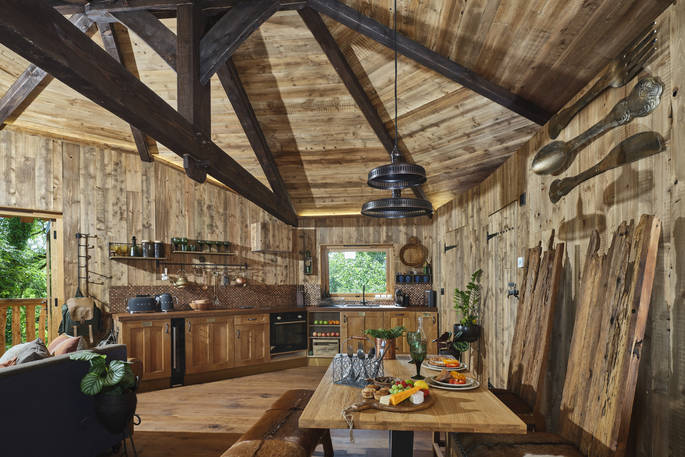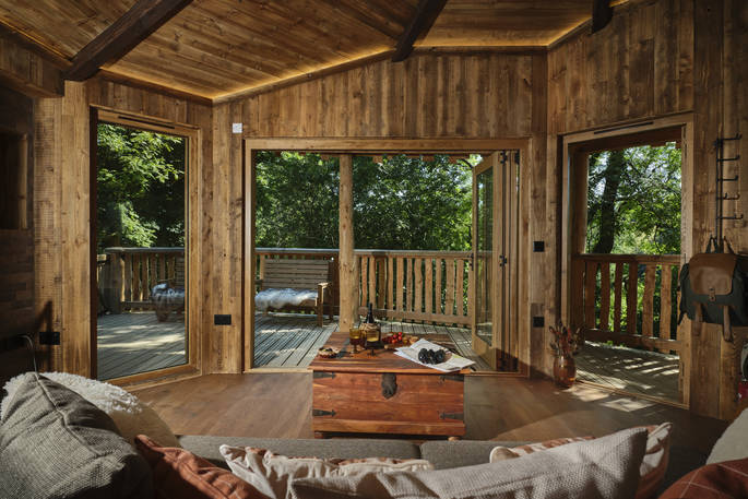 The treehouse living space is huge and designed to bring the outdoors in, with a comfiest sofa and bifold doors, you can switch off and watch the world go by. If you prefer the big screen, then you will love the movie projector in the living room and make sure to grab some popcorn. There’s also a well-equipped kitchen, which can cater to some romantic dinners by the fire – though if the weather’s just right, you might be tempted by the pizza oven or the outdoor stove in the private woodland terrace area that overlooks the woods and meadows. Or just relax in the double hammock or sink into wood-fired hot tub.