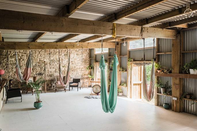 - Communal areas include the gallery, yoga barn, sauna, outdoor beds, Apothecary Garden, and the grounds surrounding the site