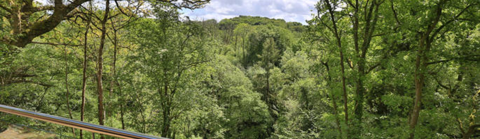 A sweeping balcony with a jacuzzi tub, framing a fabulous mirrored space that hangs in the woods on the borders of Exmoor