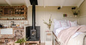 Once you’re tucked up in the hut, you never need to leave, with an en suite bathroom and induction hobs making the space a cosy little home. The craftsmanship of the hut means you’re well insulated and comfy all year round, but there’s a wood burner if you need a top up of warmth from the underfloor hearing or just the atmospheric glow of the fire.