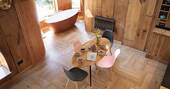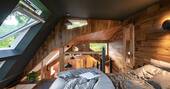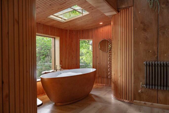 Inside, it’s no less stunning. This is no quaint, rustic escape. This is luxury amongst the treetops. Wooden panels adorn the walls in rich oaky tones that follow every hard line and curve of the interior – from your mezzanine bedroom to the picture windows that surround the freestanding bathtub.