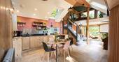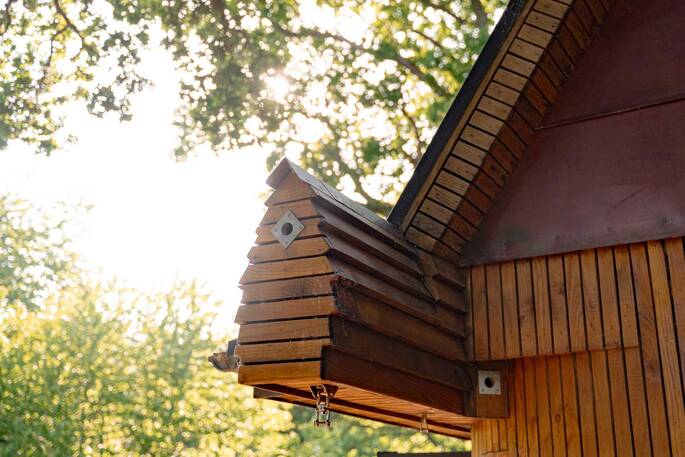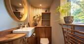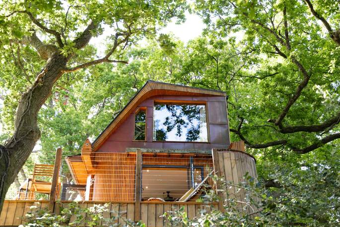 A few metres off the ground, and under the shade of oak trees – Coast and Canopy Treehouse is swaddled in woodland, and just a couple of miles from the golden sands of Charmouth Beach. It’s a wonder to behold, with its back mirrored to disappear into the treeline, and its front in the soft wooden tones of the forest.