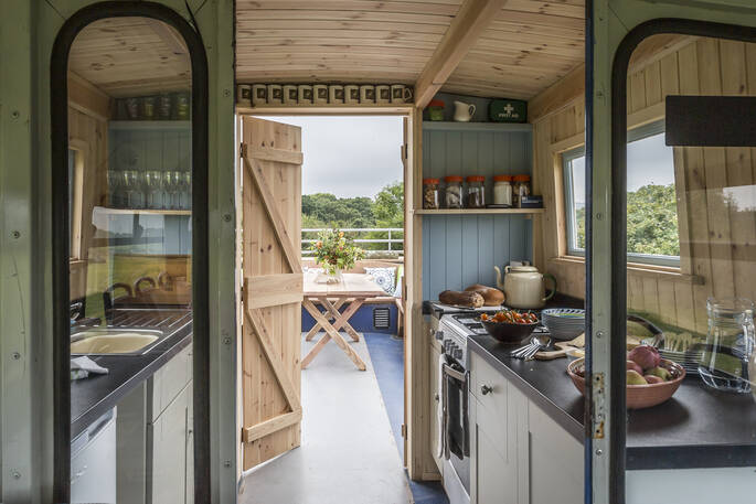 Now it’s done working, it’s been refreshed to create a comfortable and cosy space including a covered kitchen on the top deck. Enjoy the views whilst dining al fresco on the top deck seating area, or from the covered seating area to the front of the bus. The bus sleeps four in single beds on the bottom deck, with the rest of the passengers disembarking for the evening and heading for the bell tent, or the bunk house (both with a double bed and two singles). Take a long soak in the wood-fired bath in the converted horse box bathroom. There are also two gas showers and a compost loo nearby.