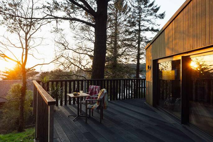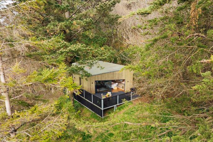 We had a wonderful time staying at Nightjars. Such a joy looking out of the main living space into the trees and ferns, and we had dramatic sunsets through them towards the sea. The cabin was really well appointed and comfortable though modern from the outside. Loved the sauna, a real treat. Thanks very much. We hope to come back soon.