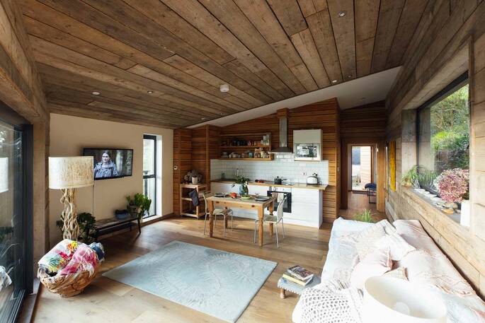 Internally and externally, they've used larch cladding, reclaimed pine and oak flooring creating a cosy and homely space with contemporary elements, but a rustic feel.