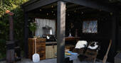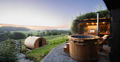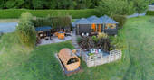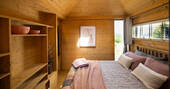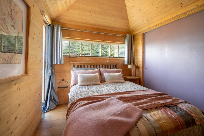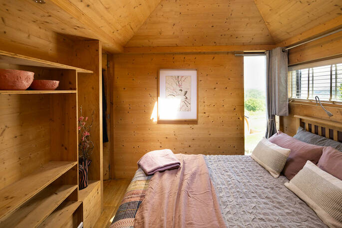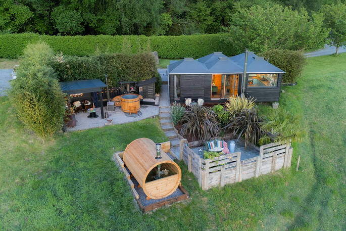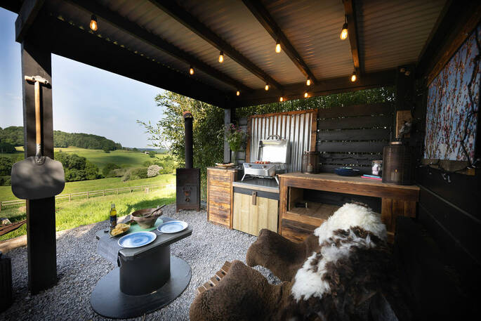 Outside there's a deck to look up at the stars, a covered outdoor seating area with festoon lights, sheepskin chairs, wood-fired oven, griddle barbecue, a hot tub and even a barrel sauna a few feet away. Or just a few steps down from the cabin - there's a sun trap terrace with a garden sofa and firepit. Andy and Jane have now moved next door and they will occasionally go by on their way to the farm, but the two buildings are screened and positioned to give enough privacy for everyone.