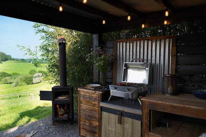 - Outside canopy houses a weber griddle BBQ and wood fired pizza oven
