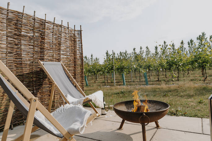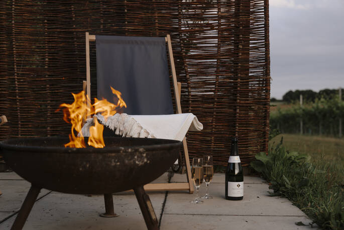 As the sun sinks low, relax and pour yourself a drink of Tuffon’s very own gin or wine, before slipping into the hot tub to soak beneath the evening sky. If you're lucky, and quiet enough, you may catch a glimpse of the abundant rabbits, hares, foxes, muntjac and fallow deer who hunt and graze among the vines.