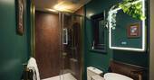 - Bathroom with a hot shower, flushing toilet, sink, and a heated towel rail