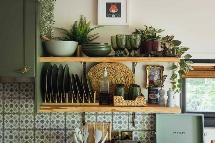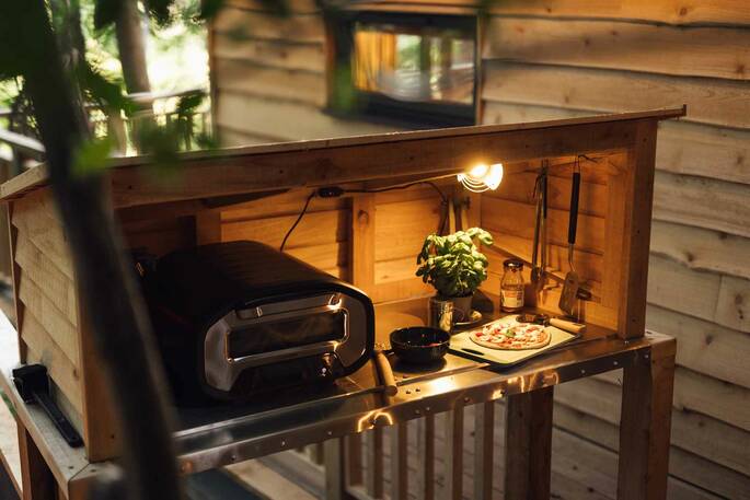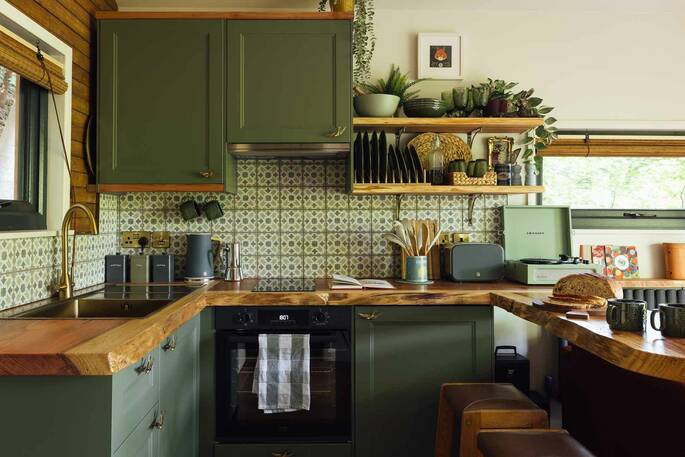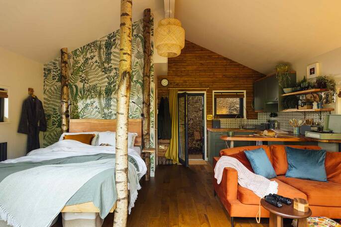 The indoor kitchen is ample and modern, and you’ll cook to the soundtrack of crackling vinyl from the vintage player, if you’re not out on the deck in the outside kitchen, using the firepit that doubles as a BBQ, or the electric pizza oven. In fact, whether you live inside or out is always up to you, with a waterfall shower indoors to start the day and a copper bath outside to finish it under the stars.