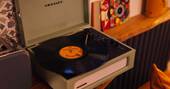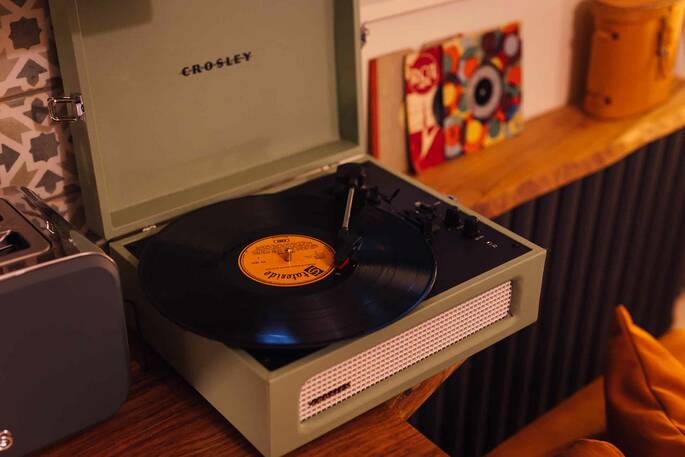 Put some music on the vinyl before relaxing in the outdoor bath tub