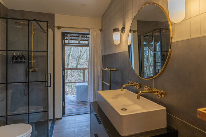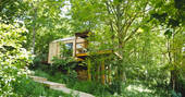 The Damselfly Treehouse is a modern, minimalist masterpiece with a pared-back colour palette and understated elegance that gives a taste of the wild in the lap of luxury, for you and your dog if you wish to bring them along. Bathing here is pretty special. There’s an outdoor shower supported by a towering sycamore and a massive copper bath on the deck.