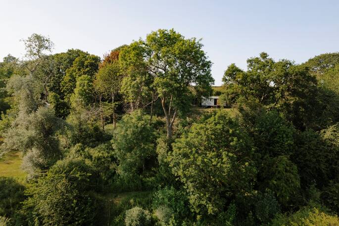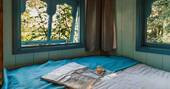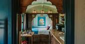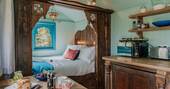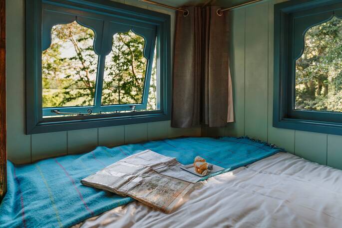A few minutes down a tree-lined path from your hosts’ house and you leave the whole world behind. Myrtle’s little pocket of trees hide it from everything but the lovely river views, even the path along the bank is just for you. You can take a dip in the cool water and use the rope to scramble back out or just lie on the grass and listen to the peace around you. There are electric hobs and a kettle in the hut, a BBQ outside and your private patch of riverside for al fresco meals. Dark wood and vibrant colours bring a Moroccan flair to Myrtle’s interior, with windows at the foot of the bed filling the space with light and keeping those gorgeous views in sight from the moment you wake up. There’s a modern shower and loo, so you won’t be stumbling through the trees at night, but the ground is a little uneven, so take care if you’re coming home late.