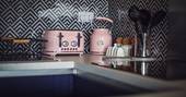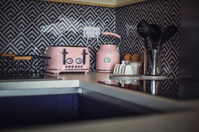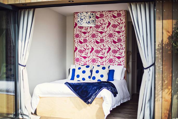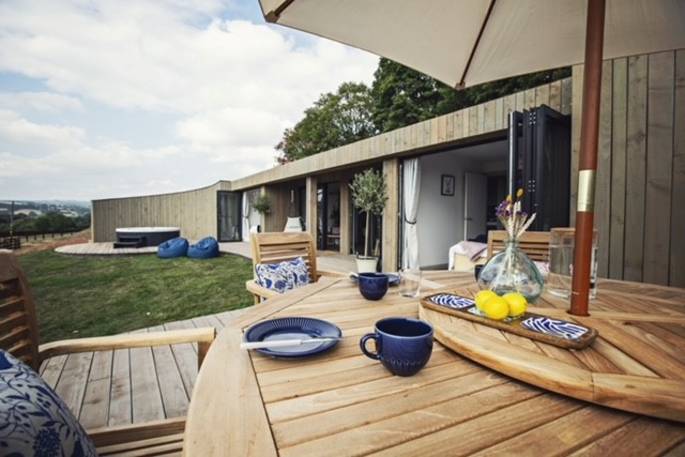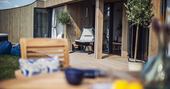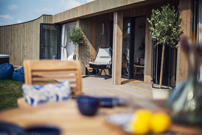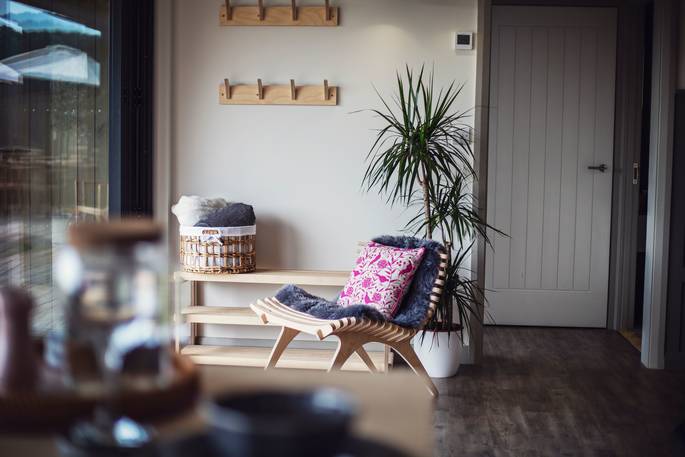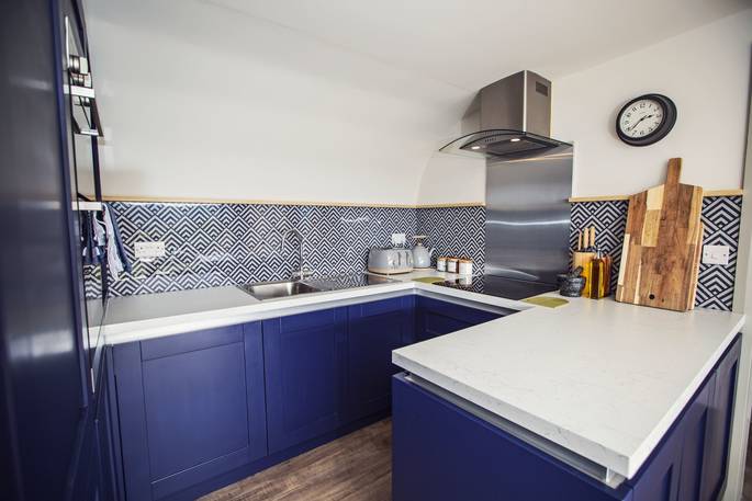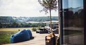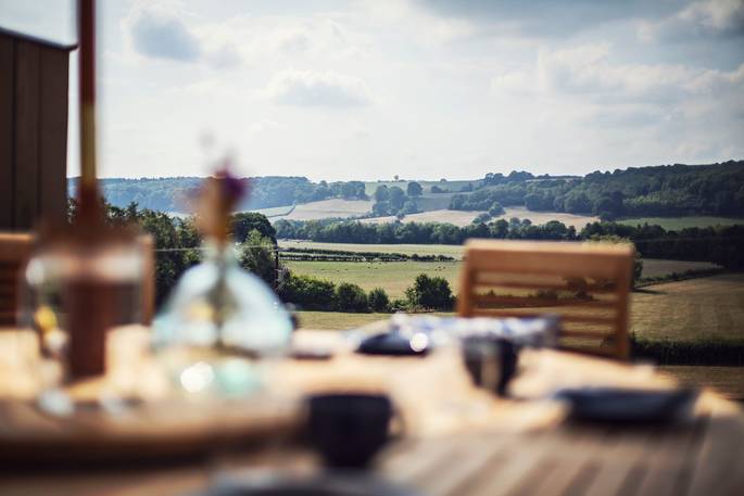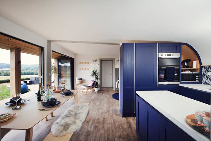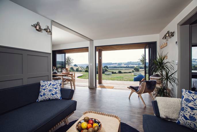 At every turn in Meadow Cabin, you’ll find your needs catered to in considerable style. A day in the life of The Meadow reads like a daydream. Morning starts when you pull back the curtains and the bifold doors to let the day in, starting off with a view of the Black Mountains in the distance. If you’ve brought your kids, you’ll see them rush to open the rest of the bifolds that stretch the front of the building, and out onto the lawn to dive onto bean bags. And if you’ve brought friends, quite likely the same. Though the kitchen might just be used for decadent breakfasts, lunches for the al fresco dining table, or hearty dinners after a bountiful day finding farm shop supplies – it’s so well equipped, you could spend the day baking delights with the accoutrements in the cupboards (ingredients not included).
