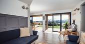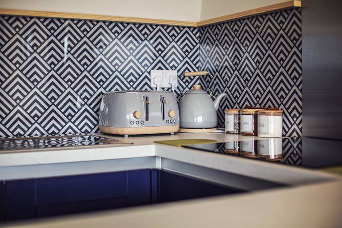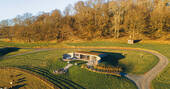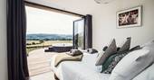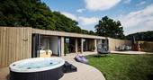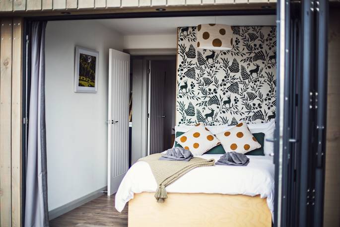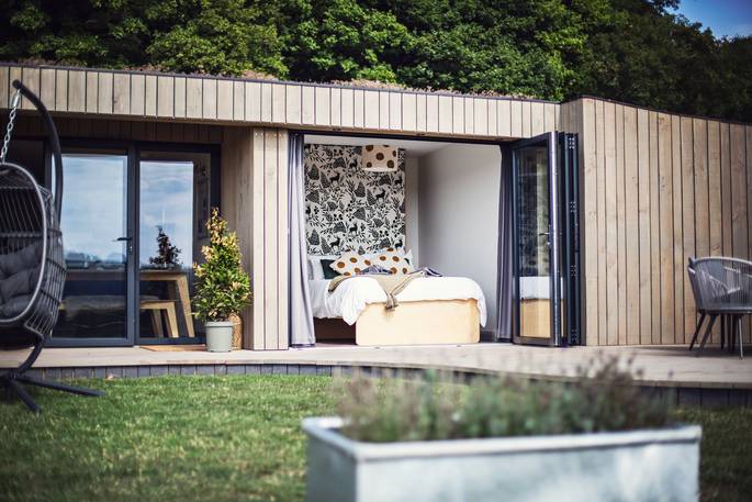Forget all you know about how a cabin is shaped. Cast aside your notions of right angles and submit to the pleasure of curves. Inside the cabin is a spacious living space for breezing room to room, savouring downtime. Breakfast is had after waking up and padding through the morning light pouring through the bifold doors that stretch the length of the building. You could take to the terrace, and eat al fresco, with views of the Black Mountains in the distance and the morning birdsong. And making plans for the day will be seriously hindered by eyeing the suspended chairs, the electric hot tub or the firepit for when the sun goes down after a day of leisure.