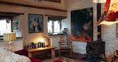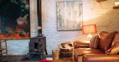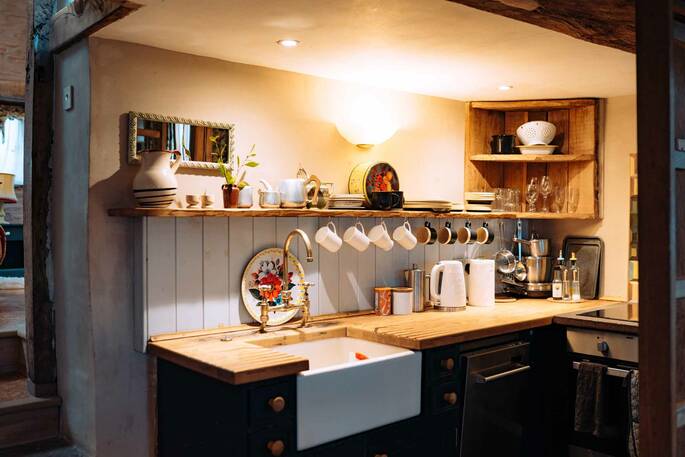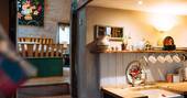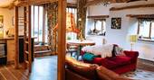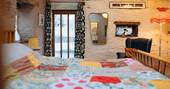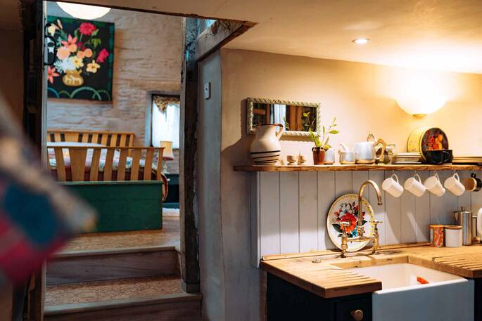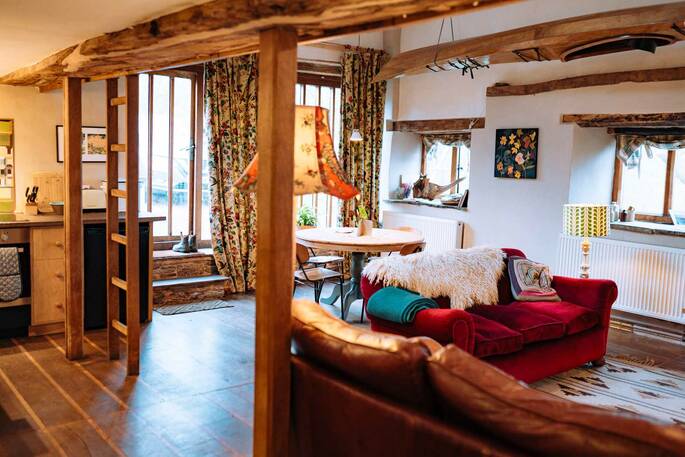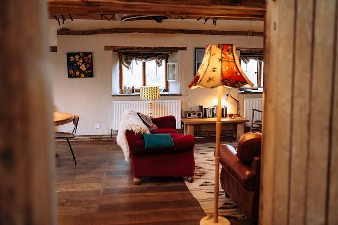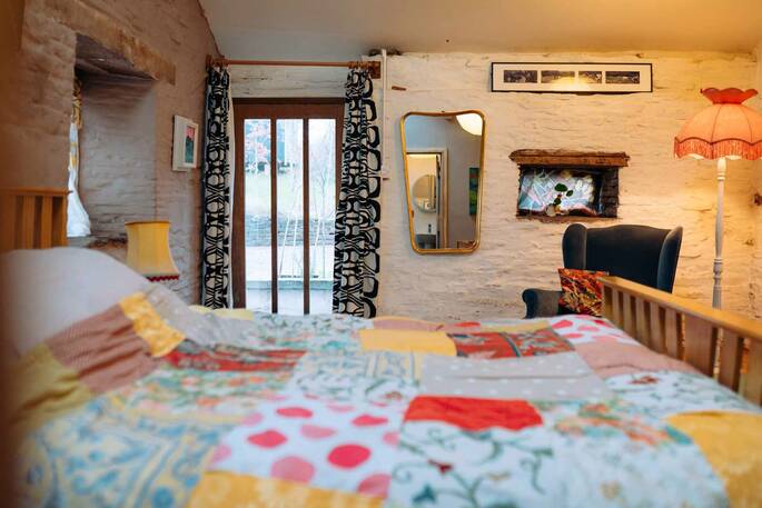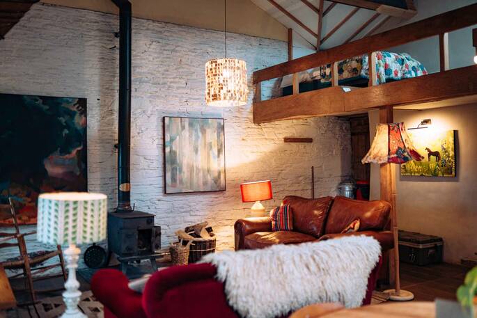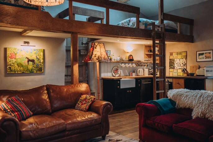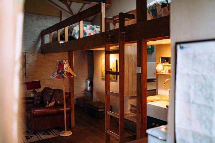 Owners Georgie and Jim, who live across the courtyard where you park, have taken their old cow byre and infused it with all the creativity and colour that has gone into their lives as artists. Repurposed and reimagined items are everywhere, as well as an inexplicable ceiling canoe, just for fun. The open-plan lounge and kitchen occupy the whole ground floor, making a huge space for two or even four to spread out on the sofas in comfort. There’s a king-sized bed downstairs and two single upstairs on the mezzanine, accessed by a ladder that must have given the cows a few problems but will prove no issue for you as you clamber up into the cosy space at night.