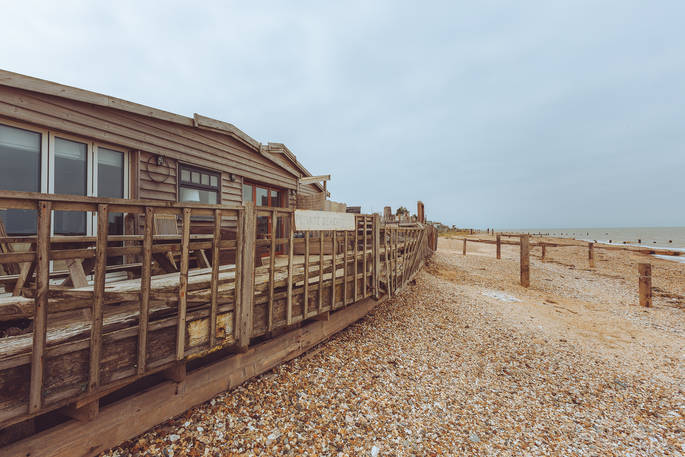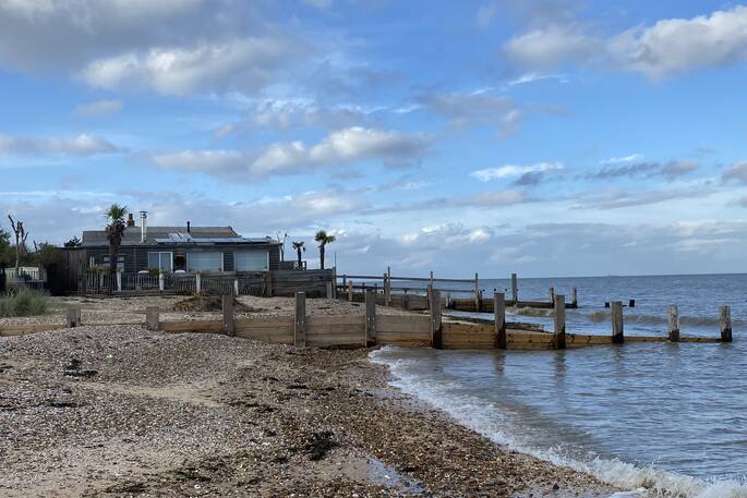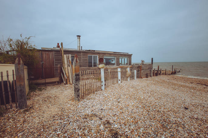 A2/M2 to junction 5, and then A249 towards Sittingbourne and Sheerness. Follow the road over the bridge onto the island, and at the double roundabouts take the signpost to the right (east) to Leysdown. Keep on the road straight through to Leysdown and straight out the other side, until you reach the sea. Keeping the sea on your left, stay on the same road right through, past the football pitches, until you reach Muswell Manor, where the road turns left. Follow the left turn and continue until the road turns to a dirt track. Follow the dirt track for 800 yards. You will see a row of ramshackle cottages up on the sea wall on the left hand side.
