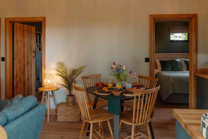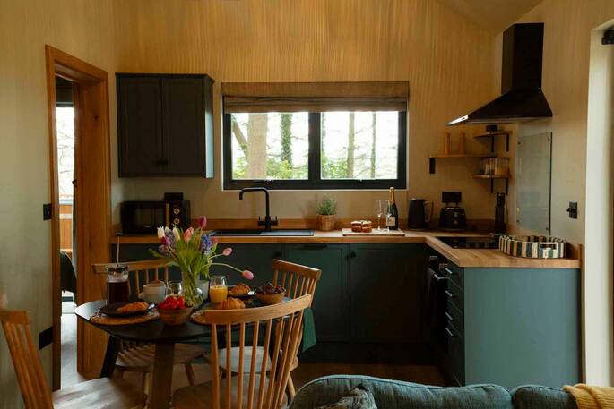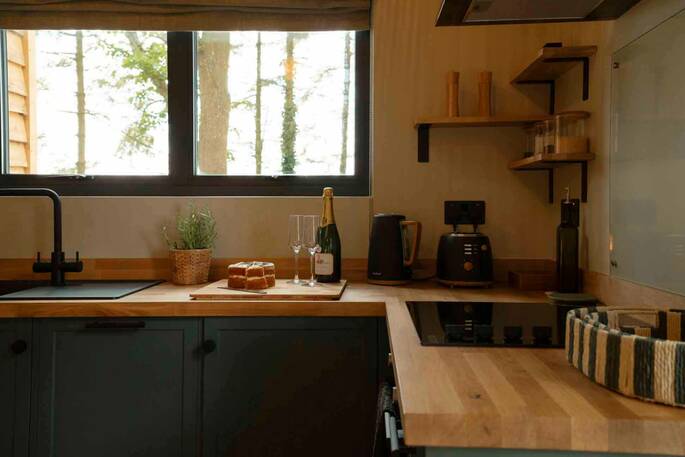 With so many market towns in the region, and many local food hampers on offer, you can cook the evening feast up in the modern kitchen or make use of the Ninja BBQ just outside – and send your delicious smoky signals into the tree canopies to call everyone back for dinner. Spend twilight by the communal firepit or, once the kids are in bed, enjoy a wood-fired hot tub, under a canopy of stars.