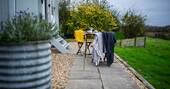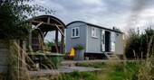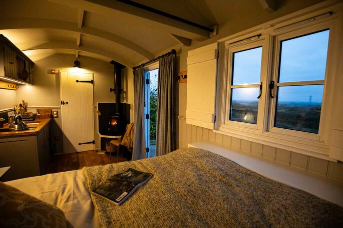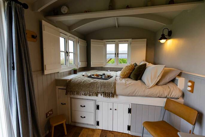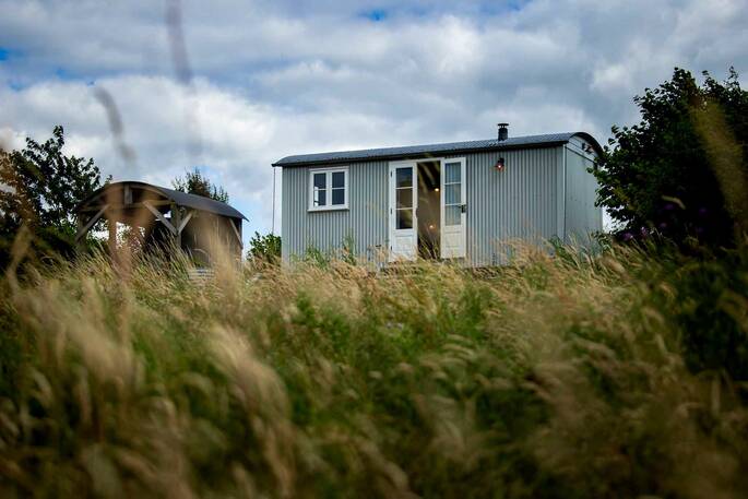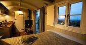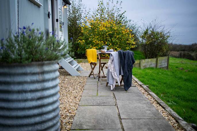Inside, it’s a medley of cool mustard, slate and reclaimed wood, and those soothing tones will lull you to sleep as easily as the king size bed . This is also where you’ll find the small kitchen – complete with a two-ring induction hob, microwave, fridge and hob kettle, should the weather keep you indoors. And your indoor bathroom, where you can grab a shower to start or finish the day’s adventures.