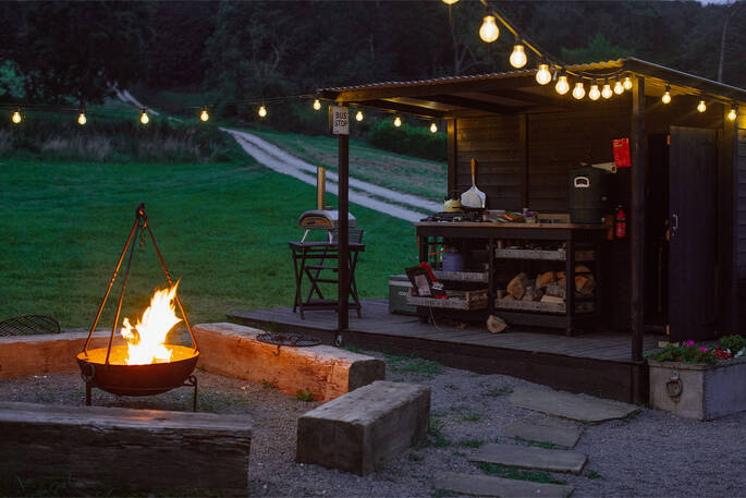 Are we done yet? No, there’s more. The bus station bathroom outdoors also has an outdoor shower, for those fresh morning starts, and the kitchen area, with a stove, pizza oven and large cool box, for those outdoor feasts by the firepit seating area, just beside it.