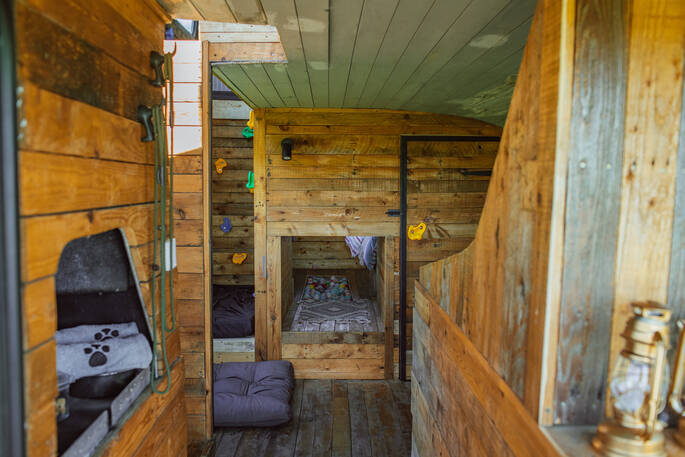 On the lower decks, you’ll find the master suite, with king sized bed, and roll-top bathtub, mere feet away, and the bar area a little further down. In the other side of the bus, there’s the kids’ and dogs’ accommodation, with three single beds, a climbing wall, a tunnel, ball pit and circus ball game.