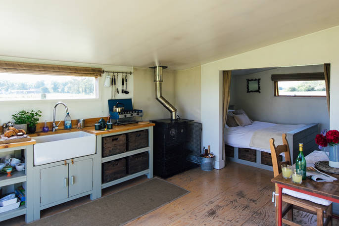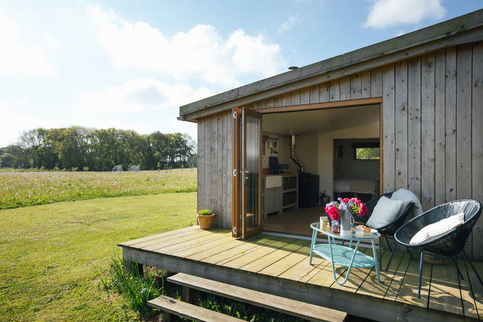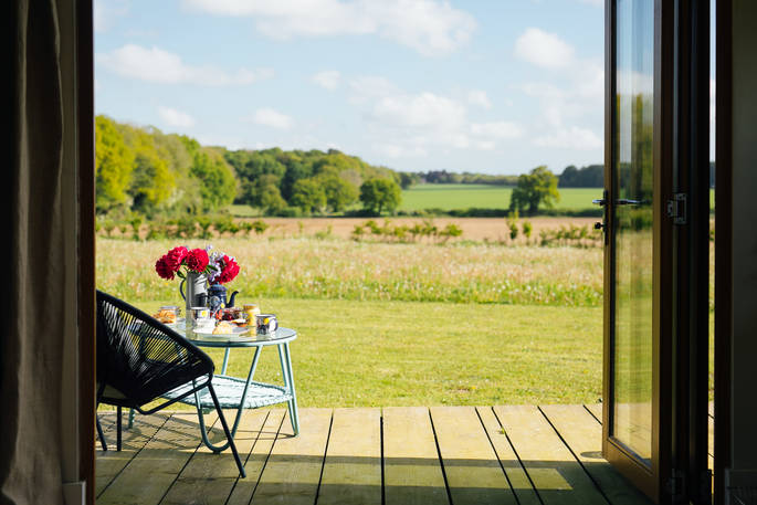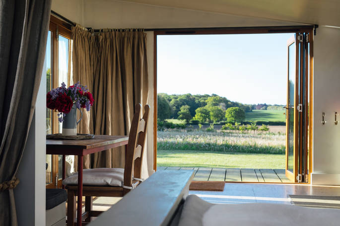 Winding through narrow country lanes with barely a whisker to spare, you’ll pull off into Nick and Emily’s farmyard (one of Norfolk’s oldest) in search of your eco cabin, perched amid the sugar beet and barley. Set far away from TVs, Wi-Fi and traffic, The Woodcock seems to float above the meadow, only the birds and occasional lowing of the cattle to break the silence. Step into a cosy country kitchen with a big Belfast sink, light the wood burner (it warms your bath tub and open-air shower, too), revel in the peace. Throw your wellies and a torch in the car – you’ll want to come prepared, whether it’s a soggy morning stroll or a nocturnal ramble to discover the resident barn owl or track shooting stars streaking across the wide Norfolk skies, perfect for couples looking to reconnect without the distraction of devices. There’s no electricity to charge your phone, night times are lit by candles, lanterns, moonlight and stars, but you’ll discover a proper flushing loo, a king-size bed hidden behind handmade curtains (the rail was forged by the local blacksmith), and everything you need for fireside suppers and drinks on your deck – including fresh mint to mix your own mojito.