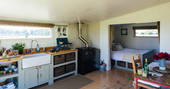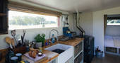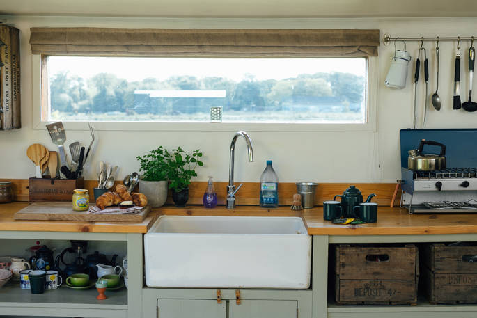 - Large recycled butler sink (hot water can be heated up in the kettle on the camping stove and you can keep it warm on top of the range cooker)