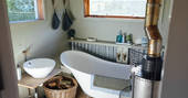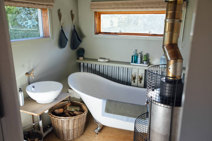 - Free-standing bath and outdoor shower (cold running water, hot supplied from the wood-fired heater in bathroom)