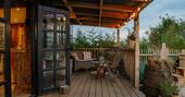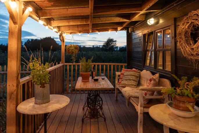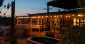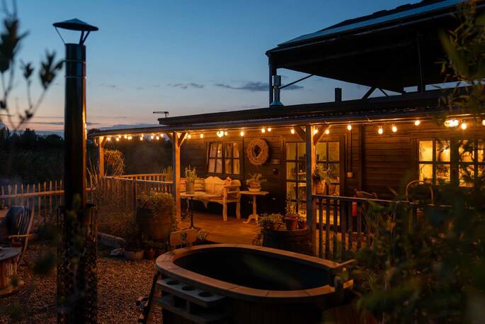 Relax in the wood-fired hot tub, which can be ready in just a couple of hours, as the sun goes down over the vineyard.