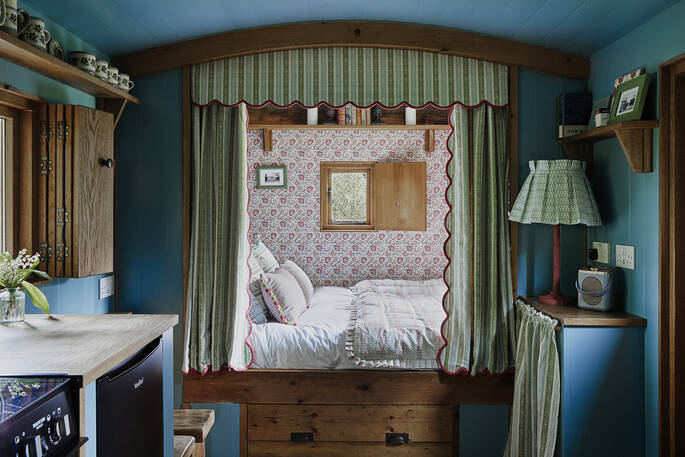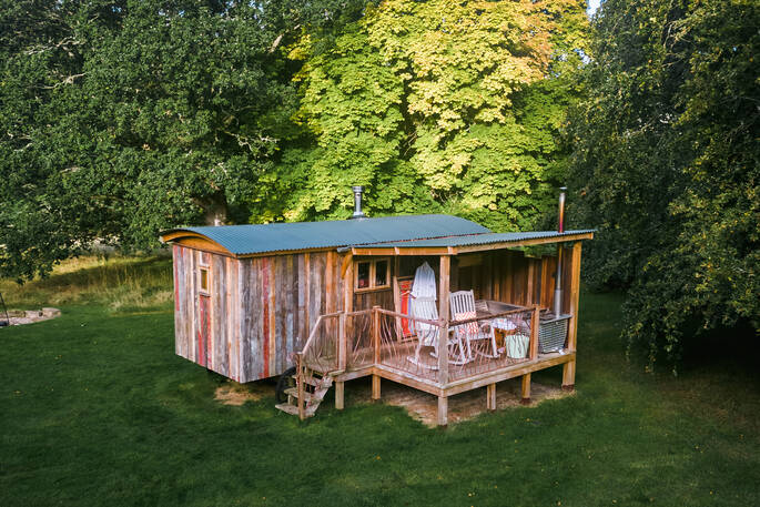Heather was handcrafted from the boards of an old flour mill, but don’t let the rustic look fool you. Inside, it’s a colourful cottage, with a wood-burning stove to keep the old-fashioned feel going, but a king-size bed, en suite shower and modern kitchen, so you can live as wild as you want to during your stay. While the interior is a joy, it’s outside that the magic happens. Positioning and screening from neighbouring hut Bracken, 20m along the treeline, means Heather is set up for you to enjoy it to the full. The huge outdoor bath on the covered porch, the rocking chairs, the fire pit - you can stroll between them all, steaming your body, resting your eyes and toasting marshmallows with nature as your backdrop. Keep an eye out for deer, badgers and foxes, or an ear out for the resident owls. When night falls, look into the depths of the Milky Way, courtesy of the area’s Gold tier Dark Sky status.