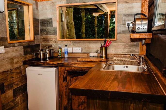 Overlooking the gentle slope of a field, Venner Heights is tucked into the treeline at Bluebell Quarry. Your space has three main areas, there’s the bedroom itself, outfitted with a double bed and a wood burner for when it gets chilly. Outside, there’s a sheltered kitchen for putting something together to enjoy on the balcony in the fresh air. Then round the back, you’ll spot your bathroom, a picnic bench where you’ll plan your adventures, and to the other side – a firepit area to sit round, and your outdoor bath – for when the adventures are over at day’s end.