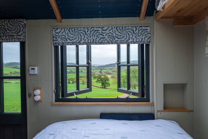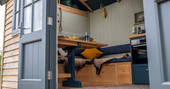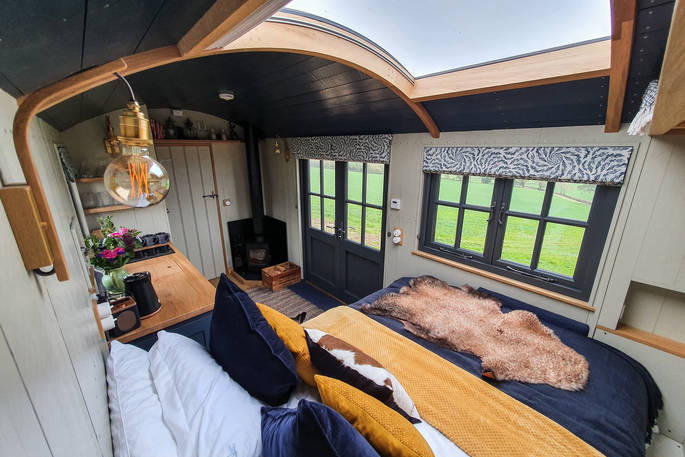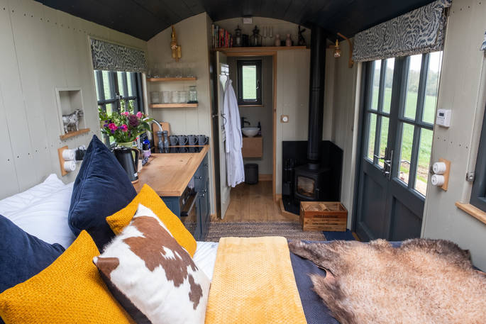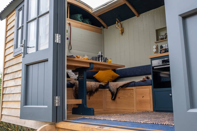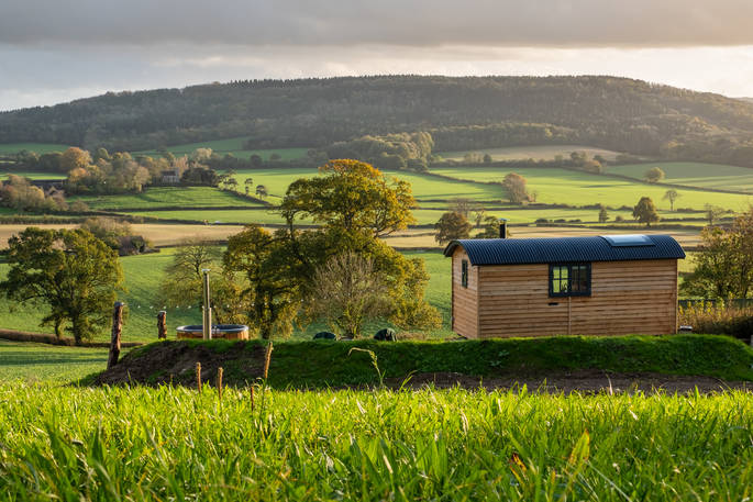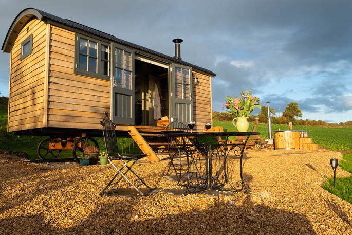 Just north of the Dorset AONB, Wild Fox is built into the Pen Hill Farm countryside, where owners Tim and Kathy are stewarding the local land to encourage the wealth of wildlife that lives in the area, as well as championing environmental practises in farming. Spend your days exploring the 500 acres, discovering the fire pit and seating area in the woods or rustling up a rustic dinner on the one right outside the hut. Night-time will see you debating whether to count the stars from the bed through the stargazing roof or from the wood-fired hot tub by your front door, which you’ll find warm and waiting on your arrival.