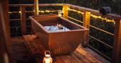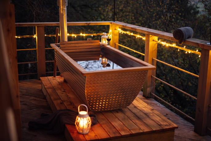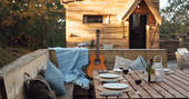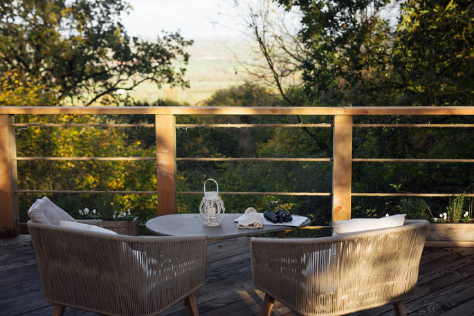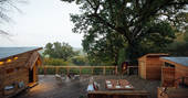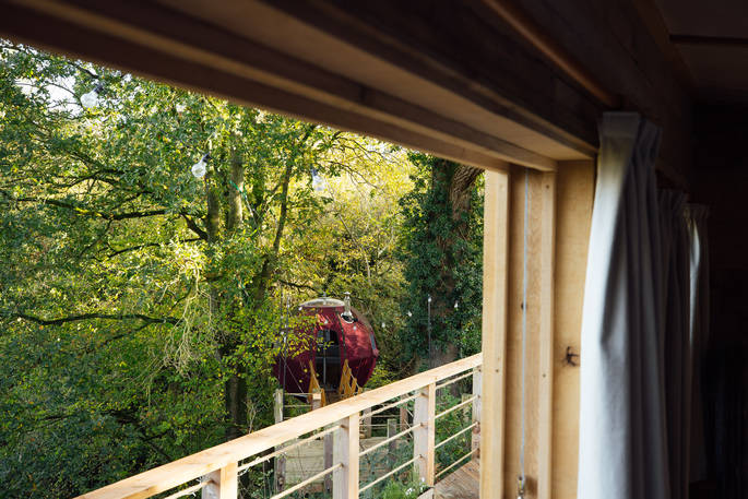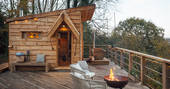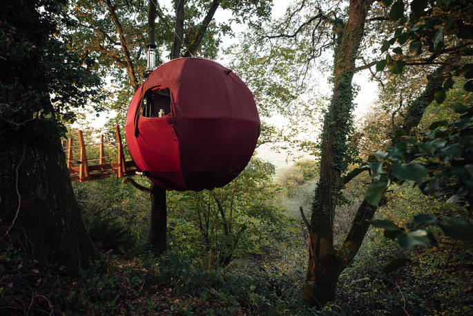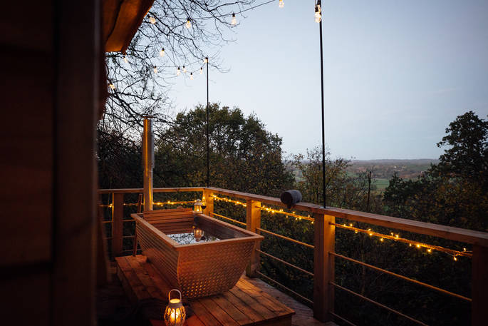 Between the Mendip hills AONB, and the Cranbourne Chase AONB, The Pennard Hide is perched amongst the trees, looking out on the patchwork fields that stretch for miles. This is a space to bring people, whether it’s your partner – to disappear together for a few days, kids, to see a wild world come to life, or friends, to share a weekend of dinner by candlelight and late-night chats round the fire. Choose either to stay in the cabin, drifting off to the log burner crackle, or in the tree tent – a suspended pod set amongst the ancient oaks (and whilst there’s a wood burner, bring sleeping bags to settle in for the night). All the spaces here are linked together by the deck and you’ll congregate round the table, bringing out breakfast from the kitchen cabin, or taking a pew as someone crafts pizzas for lunch. The real magic starts when the sun goes down, and the entire site is lit up with fairy lights, which will be your cue to start the wood-fired bathtub – and settle down with a glass of something to count the stars.