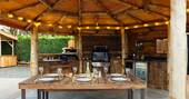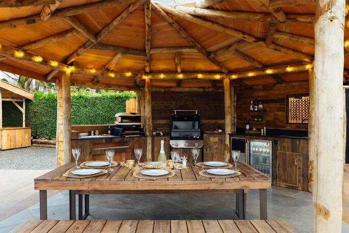 - Outdoor covered BBQ area with a Weber gas BBQ, Gozney Arc XL pizza oven, fridge and seating for six