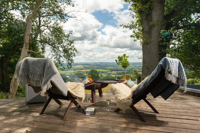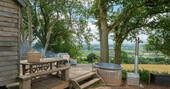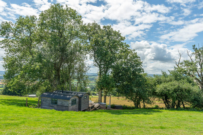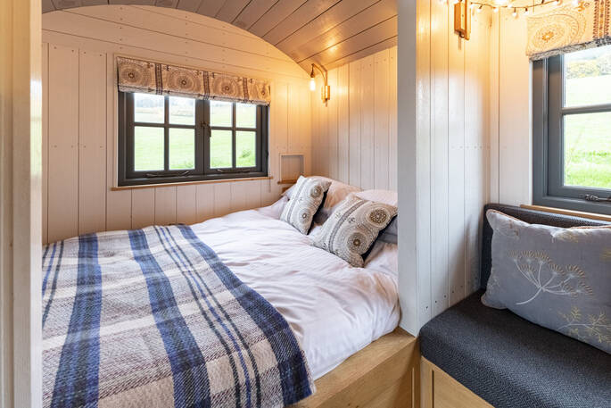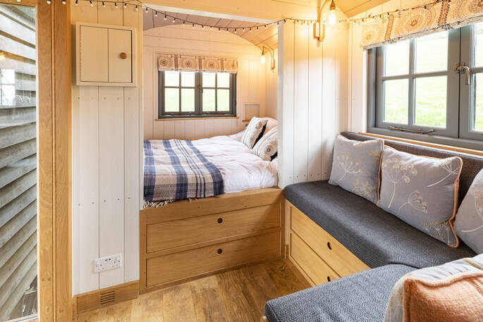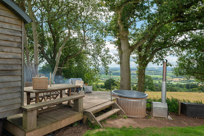 Herdwick is a space crafted to immerse you in comfort and the peace of the Quantock Hills. From one deck you can look out at immense views of the countryside as the sun goes down, but there’s another that catches the morning light, perfect for that first cup of coffee. Inside, a king-size bed occupies one end of the shepherd's hut along with a small single, and another double folds down into the dining area. All three beds come with thick duvets and blankets, plus the occasional sheepskin from the Owner's very own flock and the warmth of the central wood-burner to keep everything toasty. You can light the firebowl out on the deck and even cook on it if you’re feeling adventurous, but the induction hobs and the kettle in the kitchen area mean not having to wait if you’re hungry from a day’s exploring. You'll also have your own private wood-fired hot tub, perfect for relaxing tired muscles!