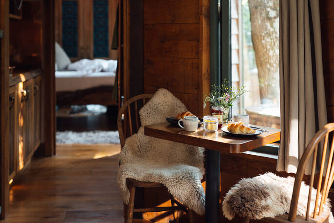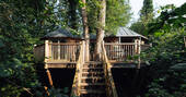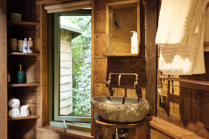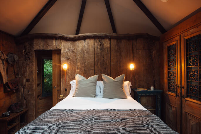 Bower Treehouse is a place of gentle, natural extravagance. Everything here is organic and deeply connected to nature, from the king-sized bed carved from stag oak, to the bath salts, candles and the woodland setting. It feels like a total escape from modern life, but with the luxurious touch of the huge outdoor bathtub adding some foamy, delicious luxury. After a long soak, you can wrap yourselves in fluffy robes, stroll inside and stretch out on the sofa with the wood-burner glowing and a glass of chilled champagne in hand. Or, if you fancy living a little wilder, head down to ground level and get the firepit or the BBQ going for al fresco cooking or toasted marshmallow desserts.