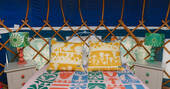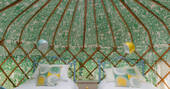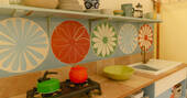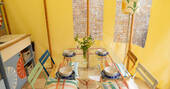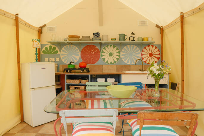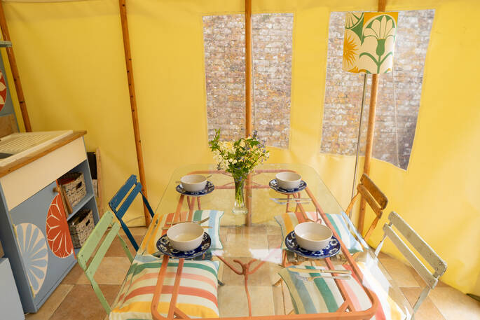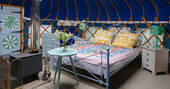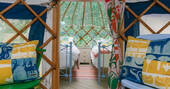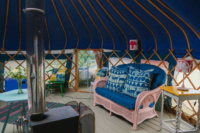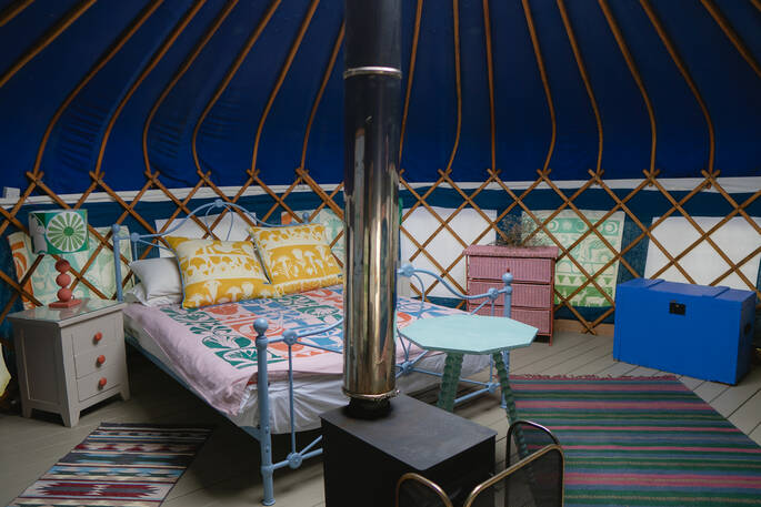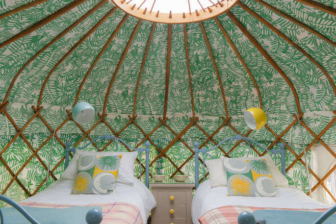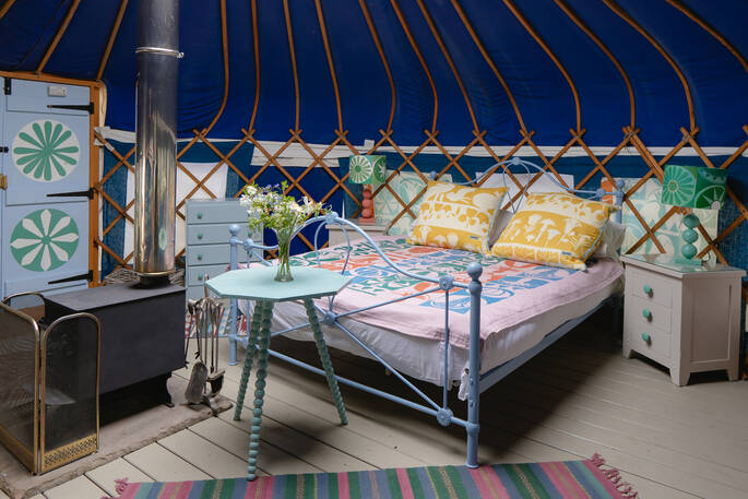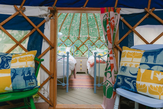 Just south of Castle Cary by a few miles, the little village of Yarlington is hiding a big secret – the stunning Yarlington House, and even more spectacular grounds, in which you’ll find Yarlington Yurt. Ever evolving, this little slice of calm is surrounded by parkland and wildlife. Its latest iteration is a bright and colourful set of interiors, recently reimagined by the owner’s granddaughter, Jessie de Salis, who’s a Bristol-based artist and printmaker.