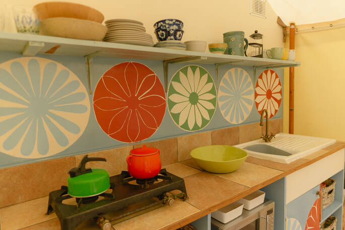 You have a main sleeping pod with a double bed and a living space, and an adjoining pod with two single beds – perfect for families, or a group of friends looking to explore this scenic, foodie part of the world. Speaking of, the other tent is your kitchen, with two gas rings for cooking and a microwave – there’s even a BBQ outside, should you prefer something smoky and grilled.