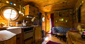 This is a place to settle in, ditch your car and maybe even your shoes, then relax. A place to stroll around, meet the animals and finally finish your book. The main space, a converted horsebox, is your bedroom, sitting room and kitchen, with a double bed, an oven with hobs and a chunky sofa in the corner. In a hut next door are your loo and shower. The cabin is a cosy space in winter thanks to the wood burner, but in summer you’ll naturally just drift outdoors, where the BBQ, deck chairs and hammock turn the meadow into your extended lounge.