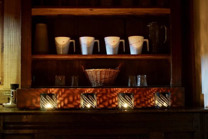 The yurts and cabin are lit by solar powered fairy lights and tea lights and a roaring open pit fire outside complete the idyllic setting. A cosy wood burner inside keeps guests toasty warm on chilly evenings.