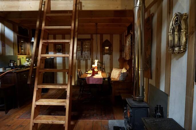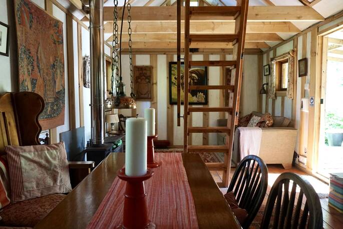 Anderida sits right at the bottom of the rambling woods at Forest Garden, waiting to welcome you to the perfect peace of the forest. The space is set up for the simple life, with a mezzanine double bed and the folding sofa bed downstairs leaving the living space free for gathering round the wood burner and breaking out the board games. You can visit the general store and the great butcher in Ashurstwood a mile away, come back past the on-site shop for some of owners Lisa and Charles’ homemade honey, jams and apple juice, then cook something superb on the gas hobs and eat outside under the cover of the veranda. A short stroll (about 180m) takes you to the showers, loos and washing up area, shared with the other cabins and yurts. But the highlight of the shared facilities might well be the Finnish-style sauna, that you can book in with the owners, and spend awhile relaxing in the steam!