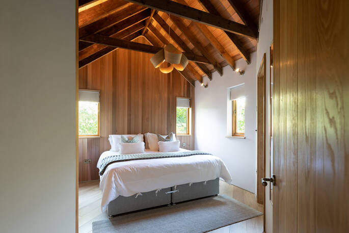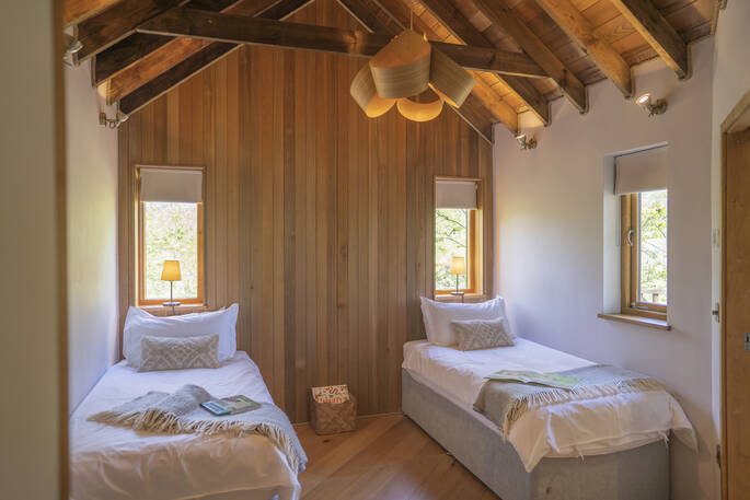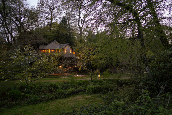 It’s hard to remember you’re in a treehouse at The Buzzardry, with a modern kitchen, luxurious bathrooms, and immaculate design all around. That is at least, until you peak out of a window, look up to the incredible wooden beamed ceilings, or stand out on the deck to see the countryside stretch into the distance, ending in the village on the horizon. The bluebell woods and the sound of the rushing stream that leads into nearby lakes, surround the large deck that encircles the treehouse. If you don’t spend time out on it for your morning coffee, you’ll be there in the afternoon to make use of the BBQ, sending wafts of local delicacies through the treeline. Take lakeside strolls through the grounds, the wildflower meadows, or across the gardens filled with 100 different varieties of magnolia, peppered with azalea, rhododendron and hydrangeas. The gardens rival public parks, except the only person you’re likely to see are perhaps the groundsman out with his dogs.