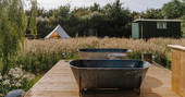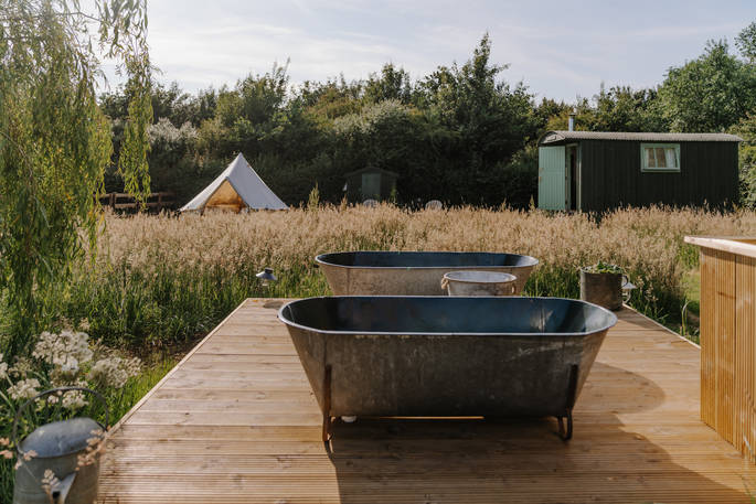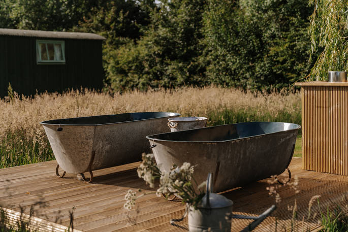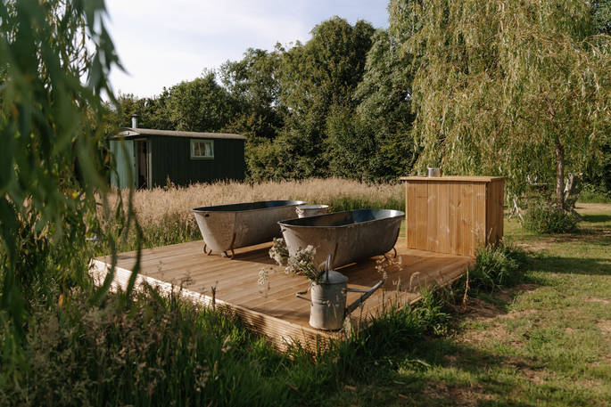 You have your own sleeping hut, as well as a separate hut for indoor tea-making, and a firepit for outdoor barbecuing (or just marshmallow-toasting) as well as a sheep trough herb garden sitting handily just outside the kitchen. You have your own secluded area of the farm with ingenious eco-loo just a few seconds away and the path is solar lit at night. There’s also an outdoor shower, set among the trees next to the hut, for a fresh start to the day – but of course, the standout feature is the twin tin baths on the deck, which you’ll undoubtedly already have a time of day in mind for.