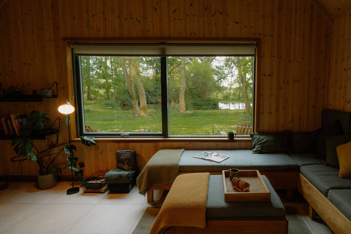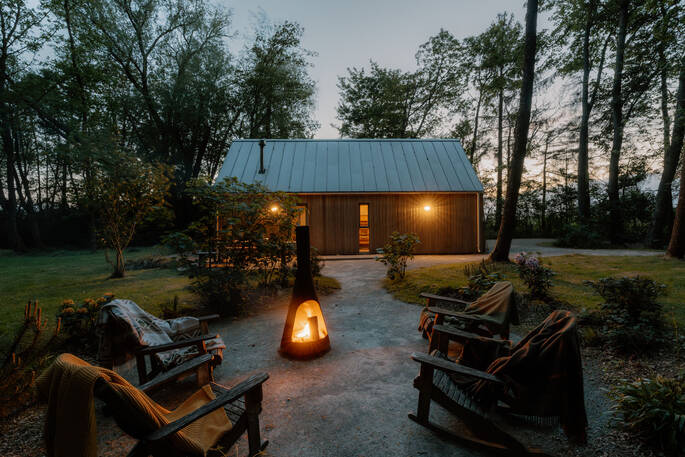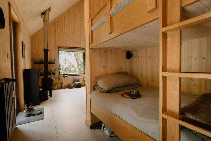 The whole cabin is super-insulated to ensure it’s toasty warm in winter and cool in summer, and cleverly designed, too - a nifty bunk bed is tucked into the hallway between the bedroom and living room. Head to the front deck for your morning cuppa or a yoga session looking out onto the pond, enjoy drinks next to the barbecue on the terrace or chat around the sunken firepit later at night.