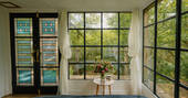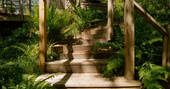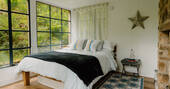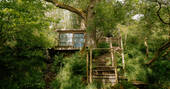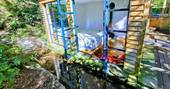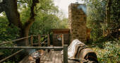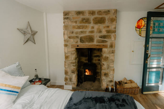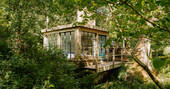 Climb the steps to a haven of calm and light that seems to have emerged from the land around it, with a stream flowing underneath to create rippling background music. It’s the sort of place to sit and think, or relax after a day in the Dales or exploring Bronte country. The windows wrap right round and the stained glass door throws golden morning sun onto the big double bed. The wood-burner keeps things cosy and the compost loo is on its own platform just a few steps outside, although there are also more modern facilities available a couple of minutes’ walk away. There is a minor road about 50m behind the cabin, rarely used but with a visible street lamp and occasionally audible through the sound of the stream.