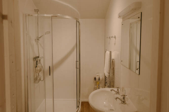 - The doorway into the bathroom is approx. 70cm wide and the step up into the shower is approx. 5cm high